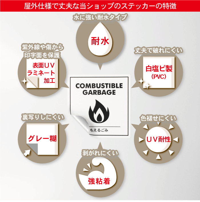 丈夫で剥がれにくい屋外仕様、耐水、耐光、強粘着、再剥離、表面UVラミネート加工、グレー糊 色 白