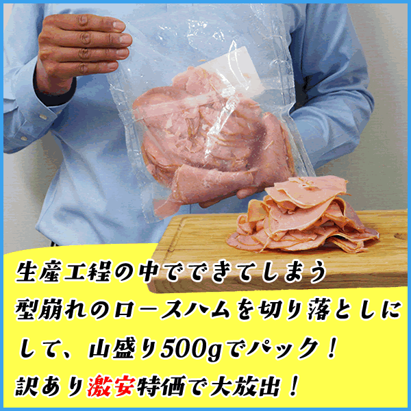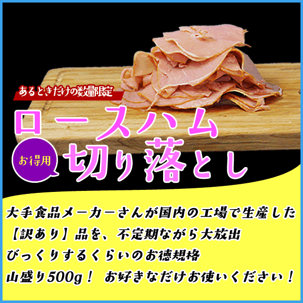 商品 お徳用ロースハム(Z) 内容:500g 原材料:豚ロース肉、豚肉、卵たん白、大豆たん白、食塩、乳たん白、豚コラーゲン、香辛料/調味料(有機酸等)、リン酸塩(Na) カゼインNa、酸化防止剤(ビタミンC)、発色剤(亜硝酸Na)、コチニール色素、甘味料(アセスルファムK、スクラロース、ネオテーム)、 香辛料抽出物、(一部に卵・乳成分・大豆・豚肉を含む) 賞味期限:※賞味期限に関してのご注意 各商品のパッケージには個別の賞味期限が記載されております。
